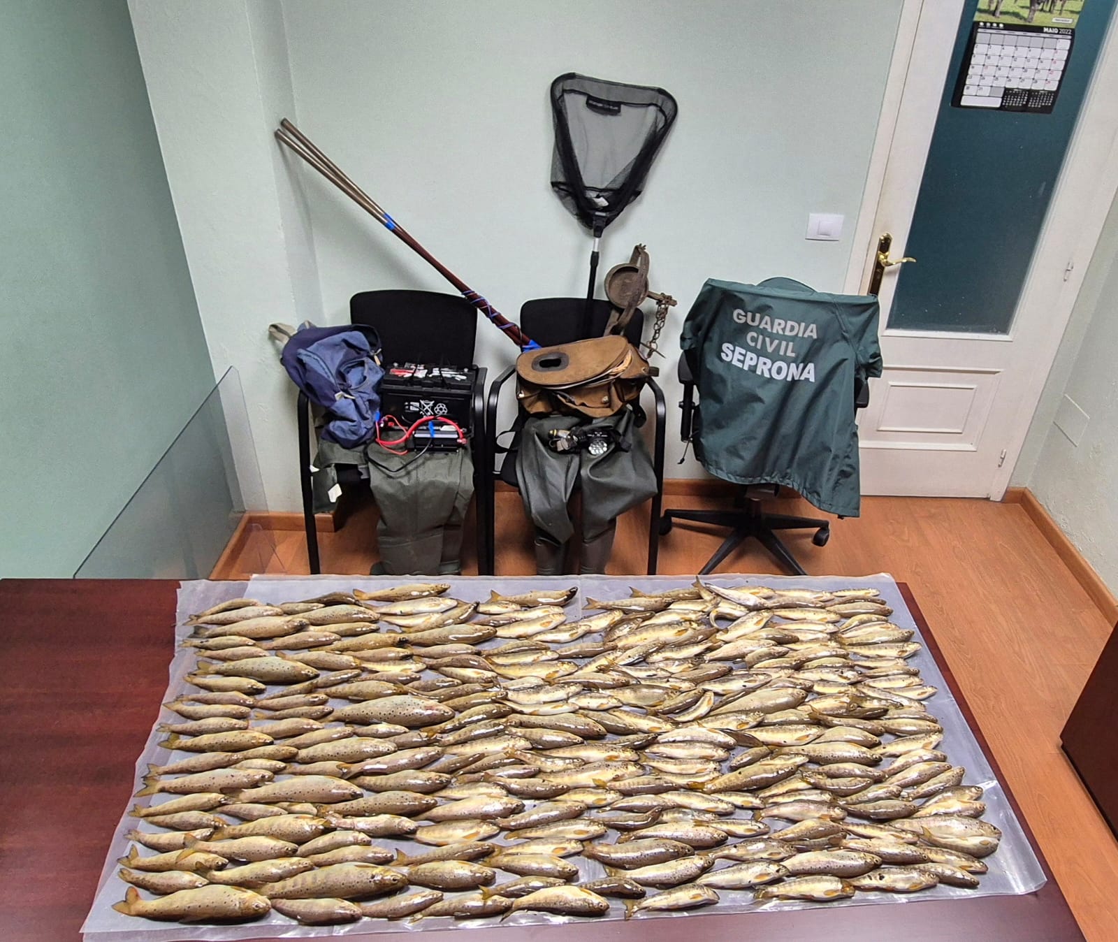 Un vecino de 72 años de A Fonsagrada y uno de 59 de Cangas de Narcea han sido imputados por la Guardia Civil en calidad de investigados como supuestos autores de un delito relativo a la protección de la flora y a fauna silvestre. Los presuntos autores de los hechos fueron sorprendidos por agentes del Eprona y Pacprona de la Guardia Civil de Lugo en la madrugada de ayer cuando abandonaban el río Rodil, en la zona de San Pedro de Neiro, en A Fonsagrada, en dos vehículos. Uno de ellos transportaba 228 truchas de pequeño tamaño, así como artes de pesca con electricidad, vadeadores, sacadera y cesta.
