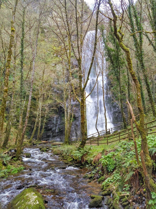 El acceso no es complicado. Desde la aldea de Vilagocende parte un sendero de poco más de un kilómetro, señalizado y de baja dificultad. El camino discurre entre robles, abedules y alisos, bajo la sombra húmeda que favorece la aparición de helechos y musgos. En los últimos metros, una pasarela de madera acerca al visitante al pie de la cascada, donde el aire se enfría y la piedra mojada recuerda que allí manda la naturaleza.