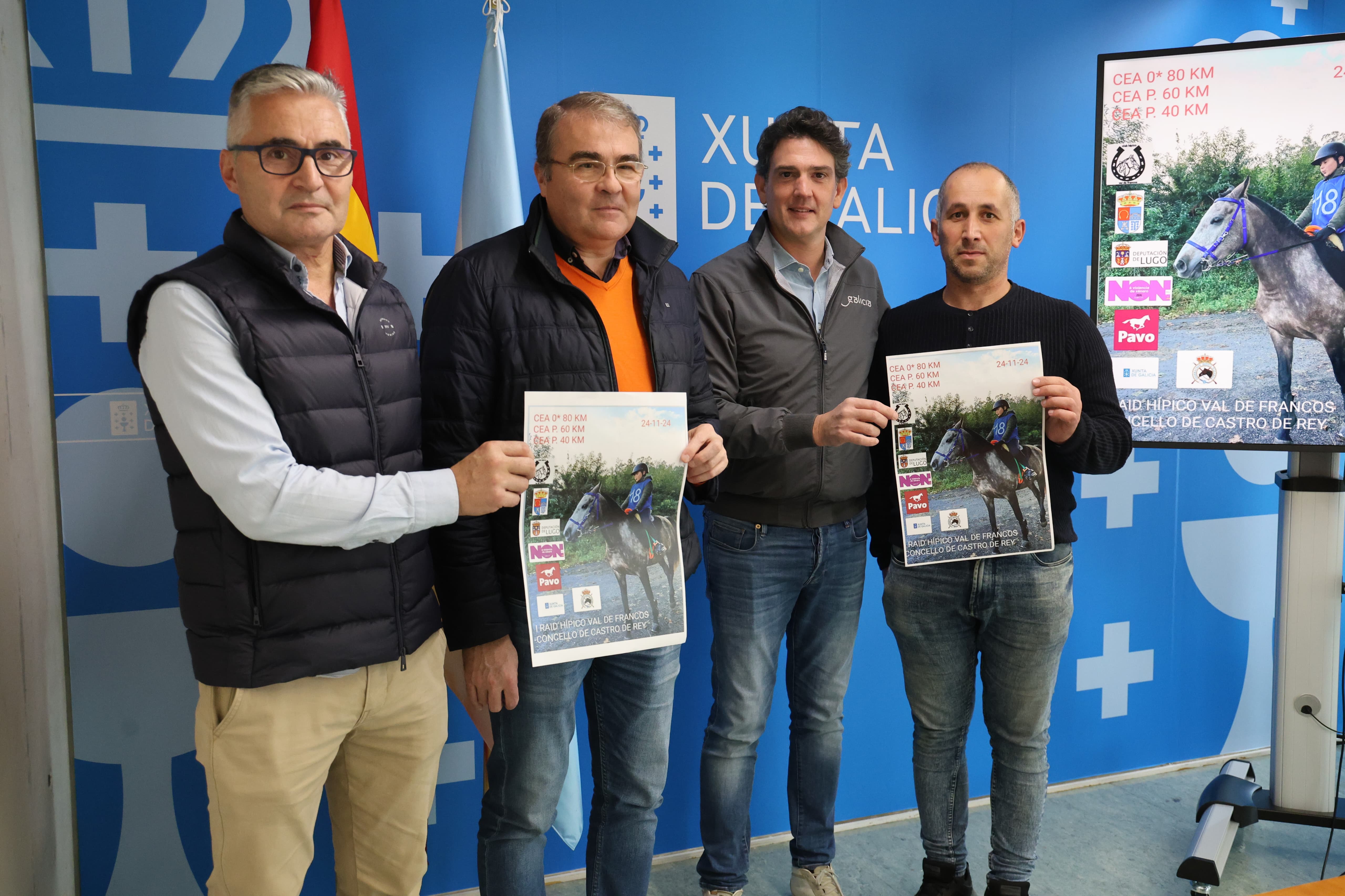 Javier Arias, delegado de la Xunta en Lugo; Francisco Balado, alcalde de Castro de Rei; y Antonio López y Juan Pita, representantes del Club Hípico Val de Francos; participaron en la presentación de la prueba.