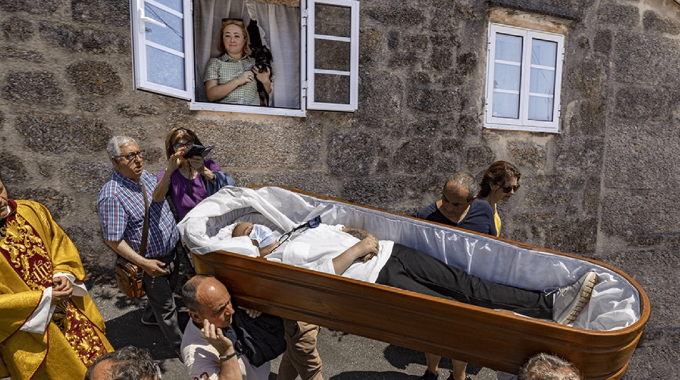 La fotografía que acompaña a este artículo es muestra de la fiesta en honor al Santo Cristo de la Agonía de Xende, en la que los penitentes se meten dentro de un ataúd y se realiza un procesión para pedir los favores del santísimo