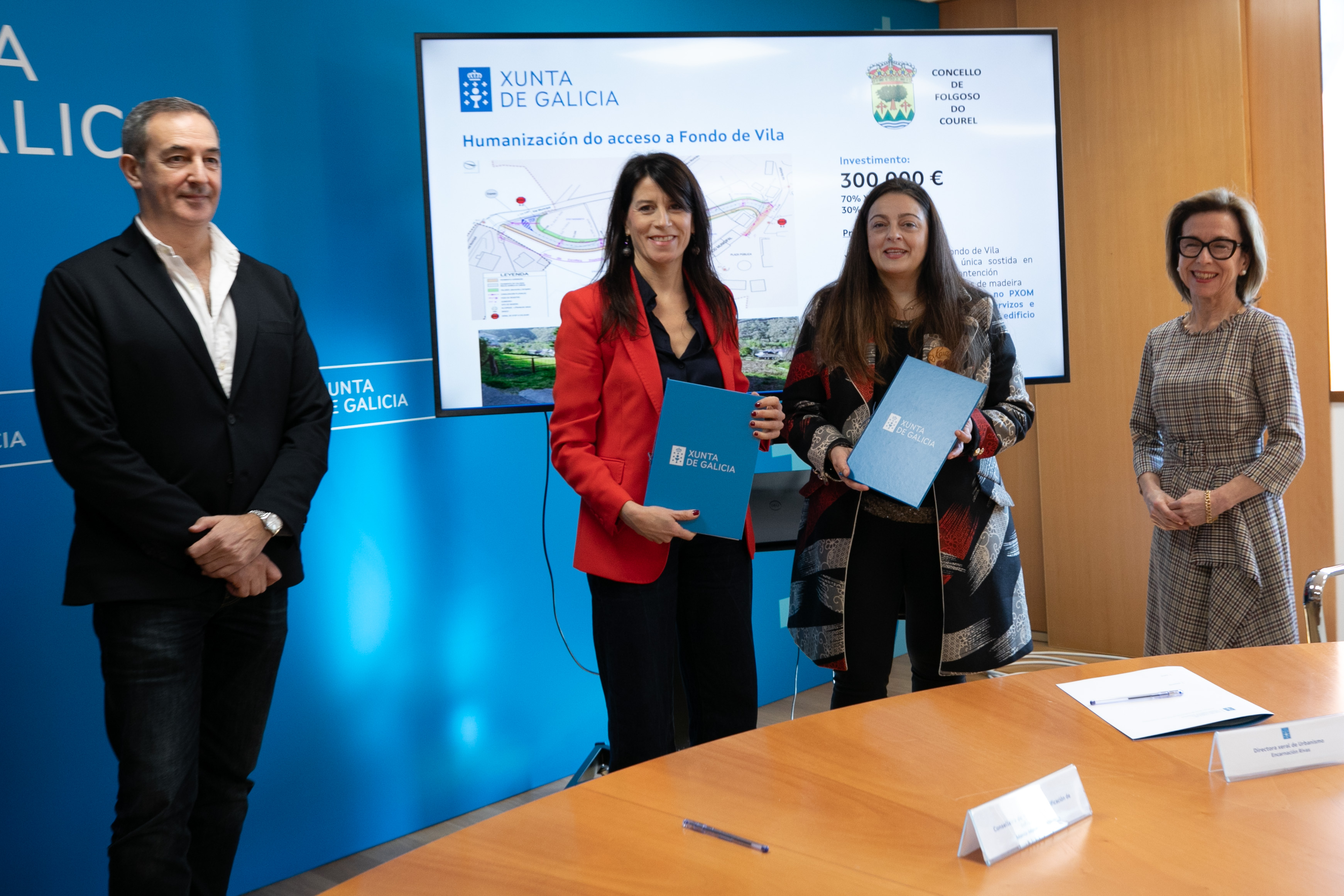 Encarnación Rivas, alcaldesa de Folgoso do Courel, y María Martínez Allegue, conselleira de Vivenda e Planificación de Infraestruturas, firmaron un convenio para la humanización del acceso a Fondo de Vila. La actuación, enmarcada en el Plan Hurbe, tendrá un presupuesto de 300.000 euros. El Concello aportará 90.000 y la Xunta, 210.000.