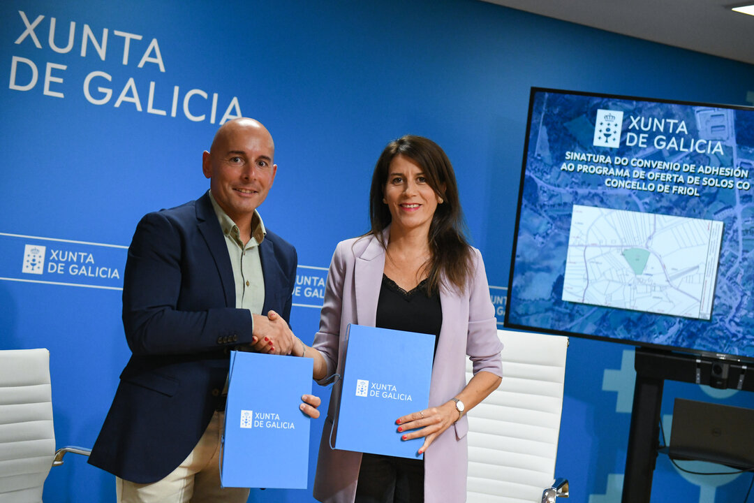 La Xunta de Galicia y el Concello de Friol firmaron ayer un convenio en el marco del programa de oferta de suelo de titularidad de las entidades locales para la construcción de vivienda protegida en el municipio lucense. María Martínez Allegue, conselleira de Vivenda e Planificación de Infraestruturas, y José Ángel Santos, alcalde de Friol, rubricaron en San Caetano el acuerdo que permitirá sacar a concurso público una parcela municipal de 6.679 metros cuadrados, situada en la Avenida da Coruña, para la edificación de hasta 18 viviendas de promoción pública.