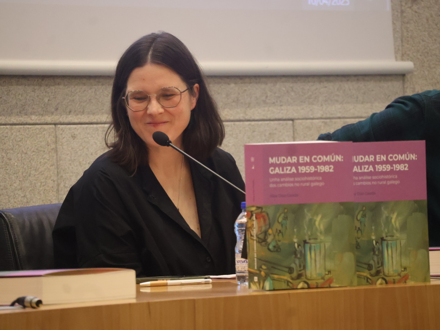 Alba Díaz Geada, doctora en Historia Contemporánea por la USC, presentó en el Pazo de San Marcos el libro «Mudar en común: Galiza 1959-1982». Se trata del análisis de la transformación de la sociedad rural gallega durante esas décadas. Según explicó, la investigación se realizó «arredor de fontes escritas e orais (máis dun cento de entrevistas) da comarca da Mariña, fundamentalmente».