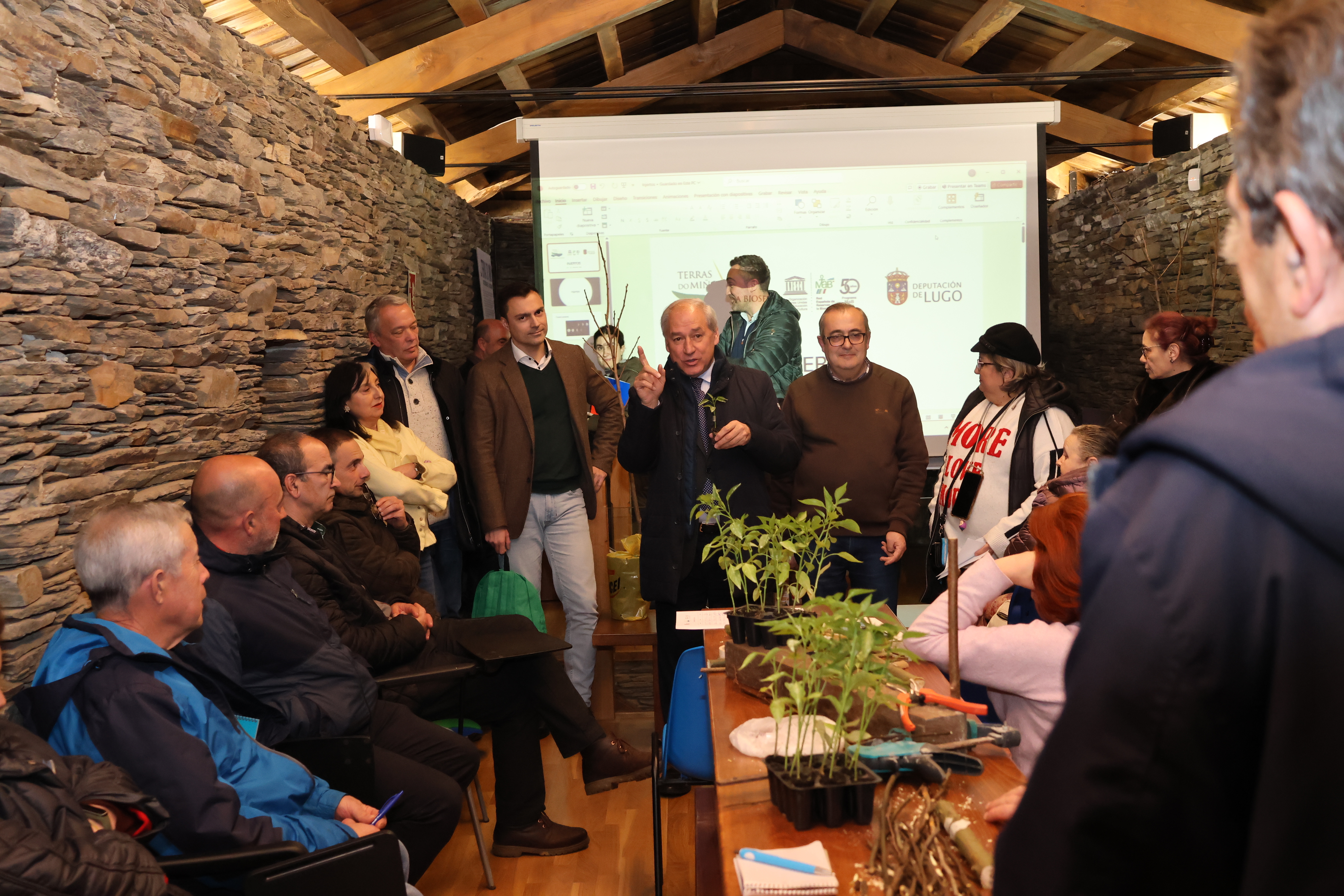 José Tomé, presidente de la Diputación, visitó a los participantes en el curso de injerto organizado dentro del programa de actividades de la reserva da Biosfera Terras do Miño. Alrededor de veinte personas participan en una iniciativa en la que también participaron Carlos López, diputado de Medio Ambiente, y Pablo Rivera, diputado de Promoción Económica e Social.