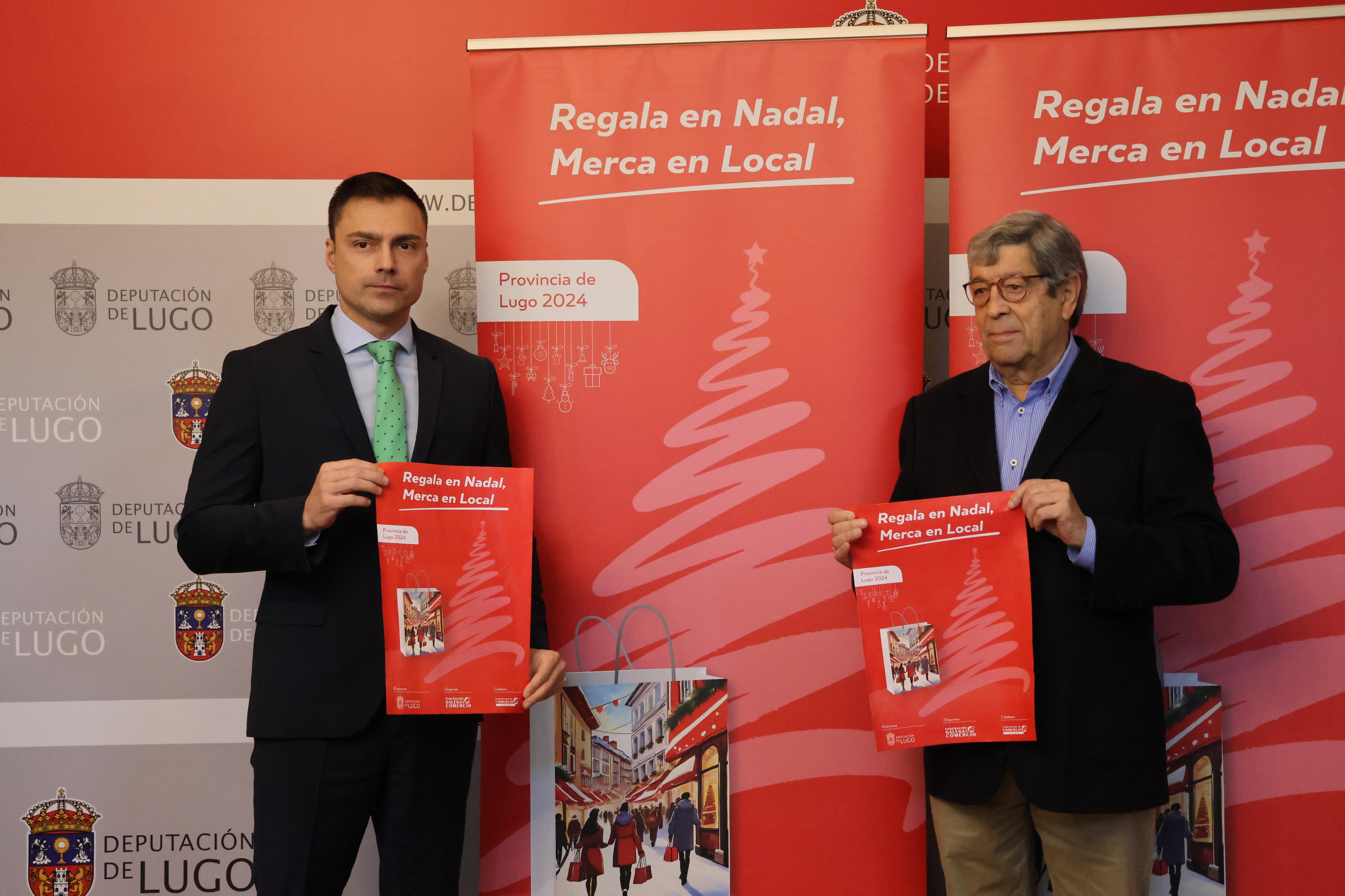 La Deputación de Lugo y la Federación Galega de Comercio ponen en marcha la campaña «Regala en Nadal, Merca en Local», una iniciativa para fortalecer el comercio de proximidad, fomentar el consumo responsable e impulsar la economía local durante una de las temporadas festivas más importantes en ventas del año. El diputado de Promoción Económica y Social, Pablo Rivera, y el presidente de la Federación Galega de Comercio, José María Seijas, presentaron hoy en el Pazo de San Marcos la iniciativa, a la que la institución provincial destina 50.000 euros.