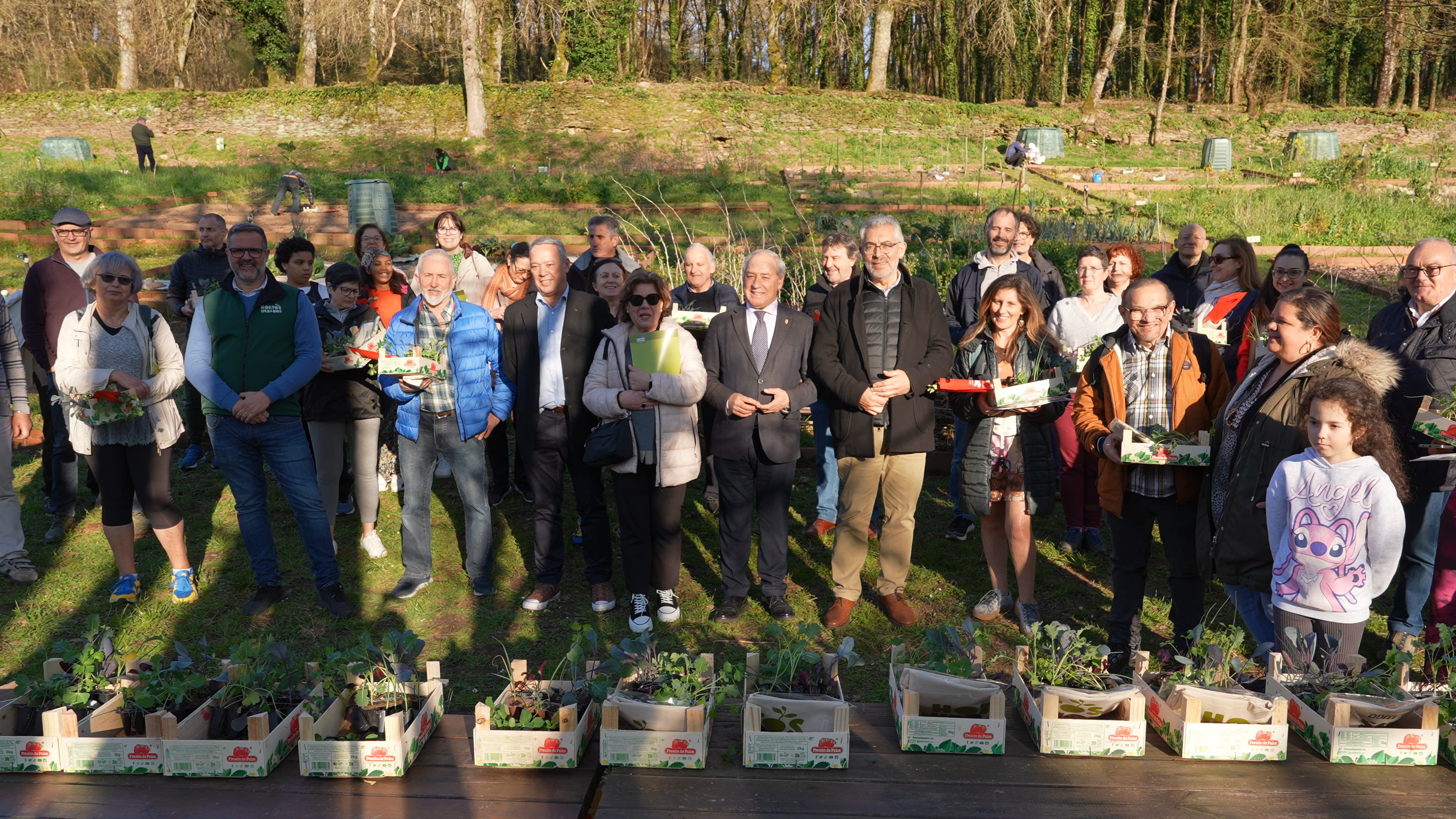 Durante la entrega de los huertos, Tomé obsequió a los nuevos usuarios con una carpeta serigrafiada con información de interés, un bolígrafo, una bolsa de tela, un lote de plantas y una pequeña encina para conmemorar el Día da Árbore.