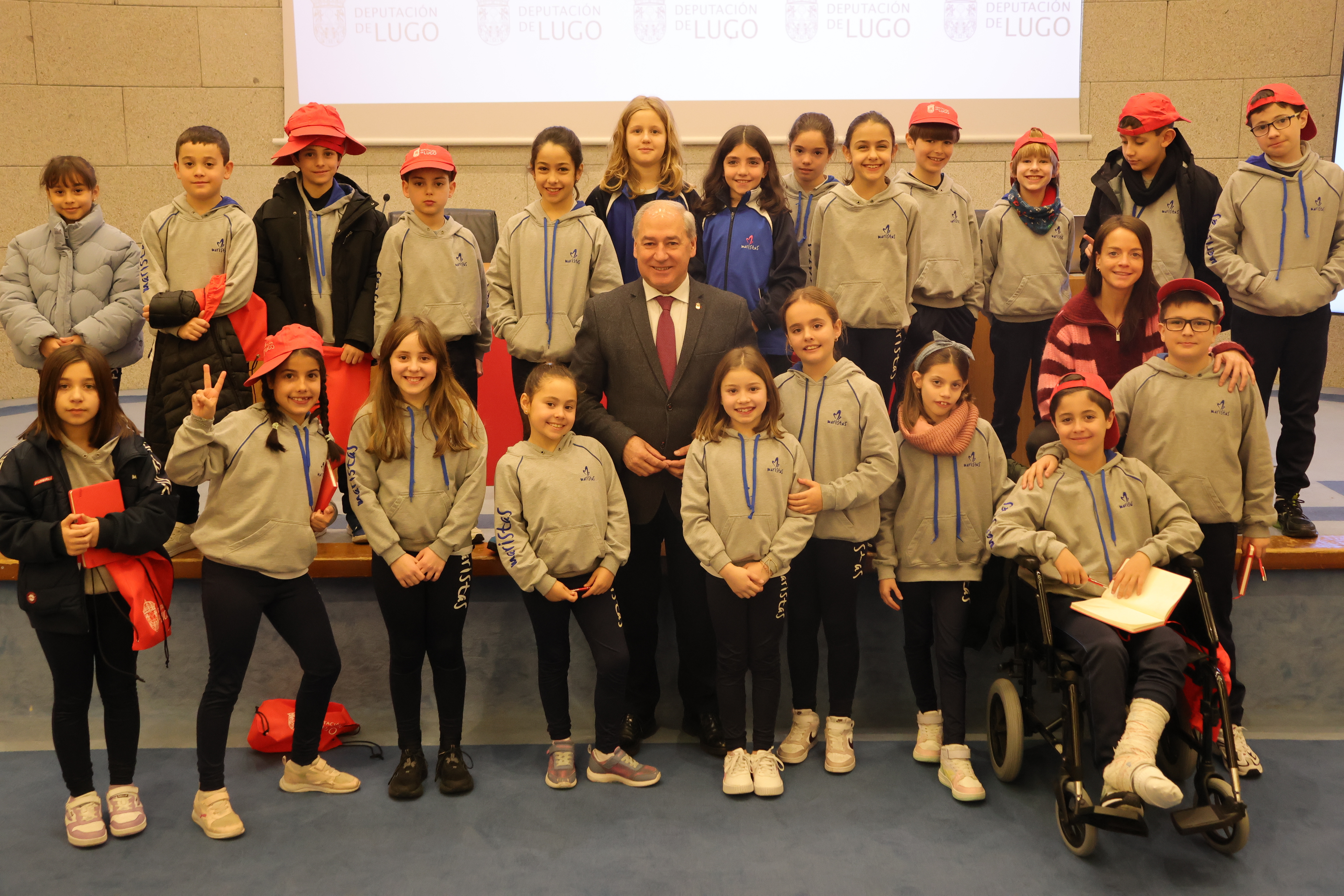 El presidente de la Diputación de Lugo, José Tomé Roca, recibió este martes en el Salón de Actos del Pazo de San Marcos a los alumnos de 4º de primaria del colegio Maristas de Lugo. «Aquí traballamos para que a provincia funcione mellor», explicó el mandatario provincial, quien respondió a las preguntas que le formularon los 25 niños y niñas que formaban el grupo.