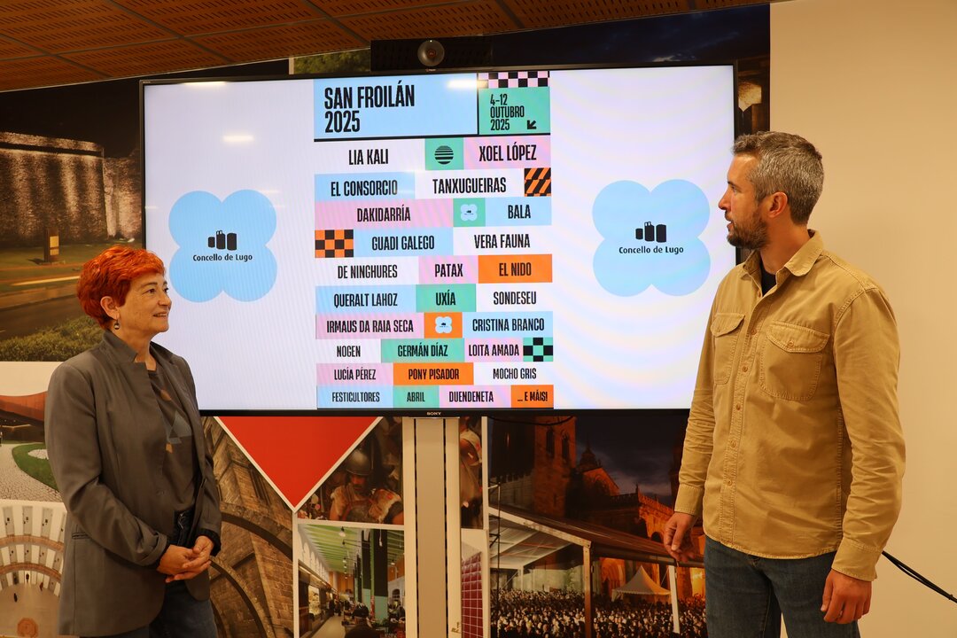 El teniente de alcalde del Concello de Lugo, Rubén Arroxo, y la edil de Cultura, Turismo e Promoción da Lingua, Maite Ferreiro, anunciaron este lunes la ampliación del cartel musical del San Froilán 2025, que se celebrará entre el 4 y el 12 de octubre.