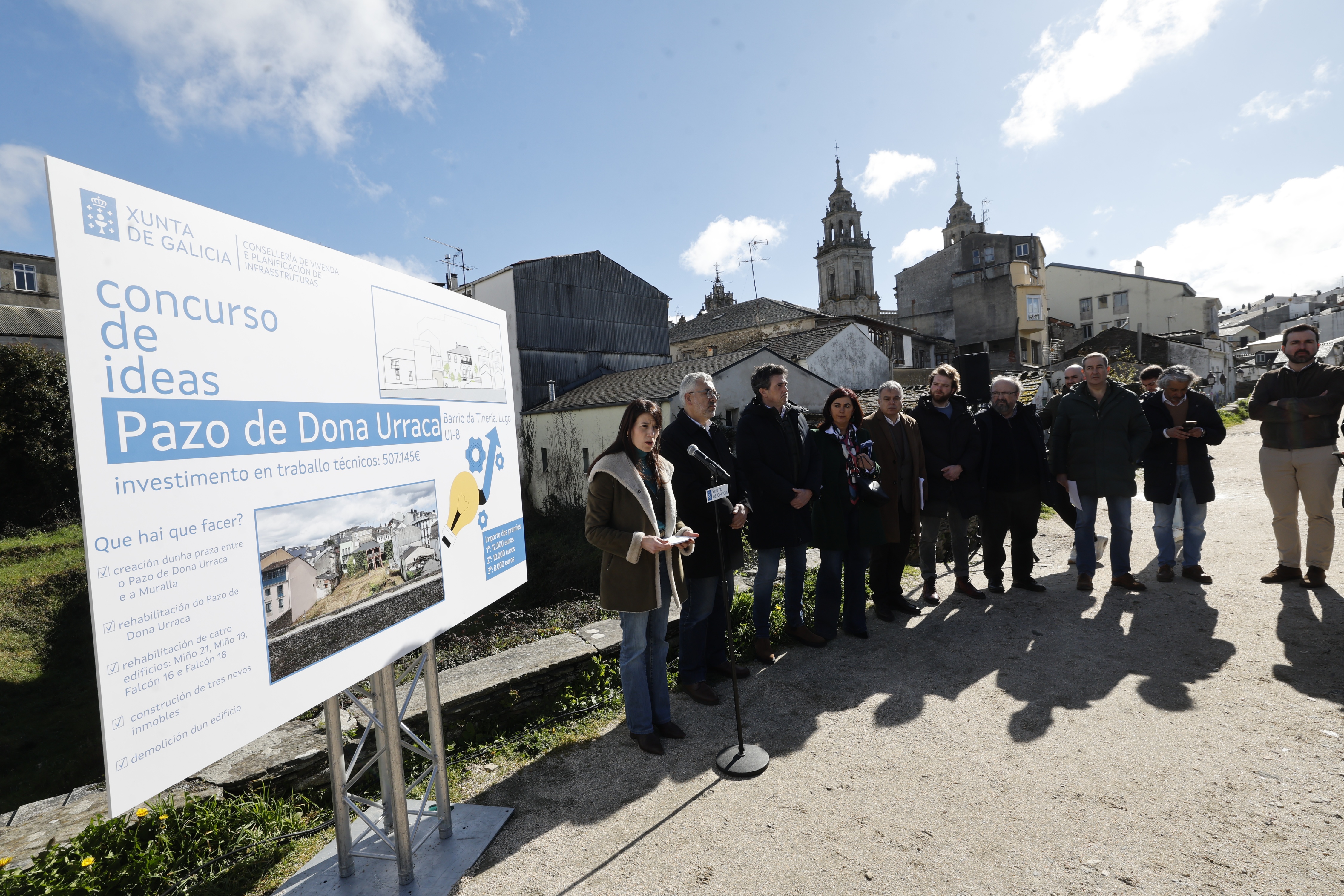 La conselleira de Vivenda e Planificación de Infraestruturas, María M. Allegue, visitó este miércoles la zona junto al delegado territorial de la Xunta en Lugo, Javier Arias, y el secretario xeral de Vivenda e Urbanismo, Heriberto García Porto, para anunciar la apertura del concurso de ideas. Este permitirá diseñar la ordenación del ámbito UI-8, que incluye la rehabilitación del Pazo de Dona Urraca y la construcción de nuevas viviendas.