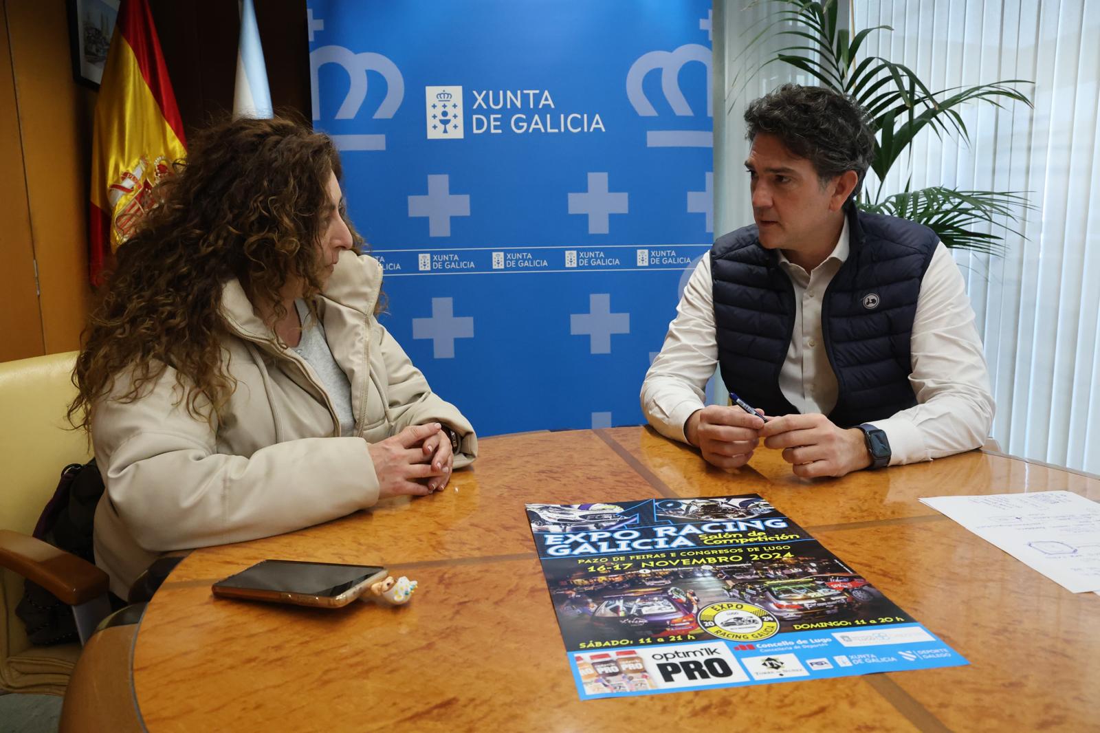 Javier Arias, delegado de la Xunta en Lugo, y Maite Vilanova, presidenta de la Escudería Miño, mantuvieron una reunión para tratar la colaboración de la institución en el primer salón Expo Racing Galicia, que se celebra este fin de semana en el Pazo de Feiras e Congresos de Lugo. La iniciativa contará con exposición de vehículos de competición, exhibiciones, cursos y charlas.