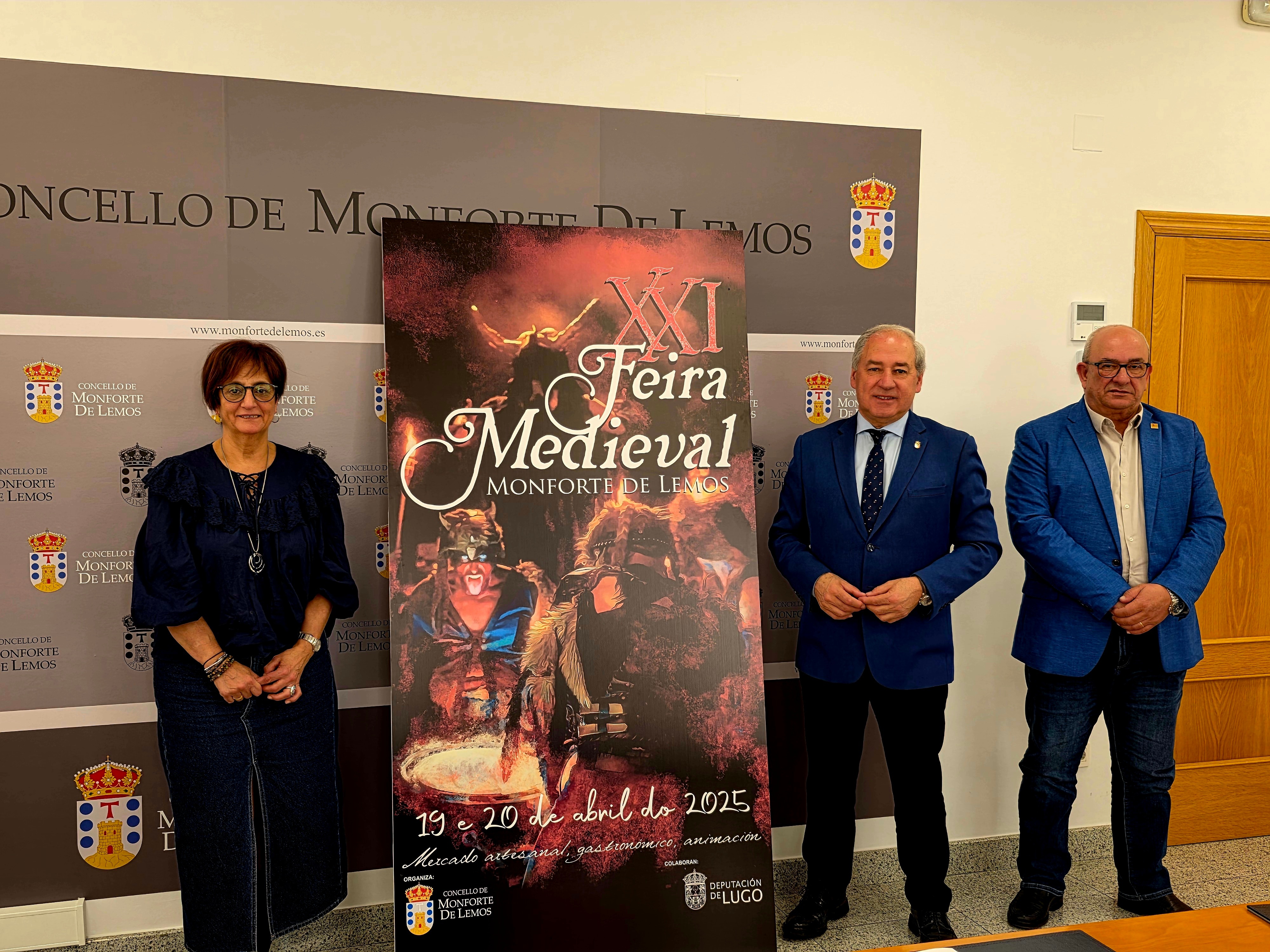 El alcalde de Monforte, José Tomé Roca, presentó este lunes la campaña promocional de la XXI Feira Medieval, que se celebrará los días 19 y 20 de abril de 2025. Lo hizo acompañado por la primera teniente de alcalde, Gloria Prada, y el edil de Medio Ambiente, Medio Rural y Servicios.