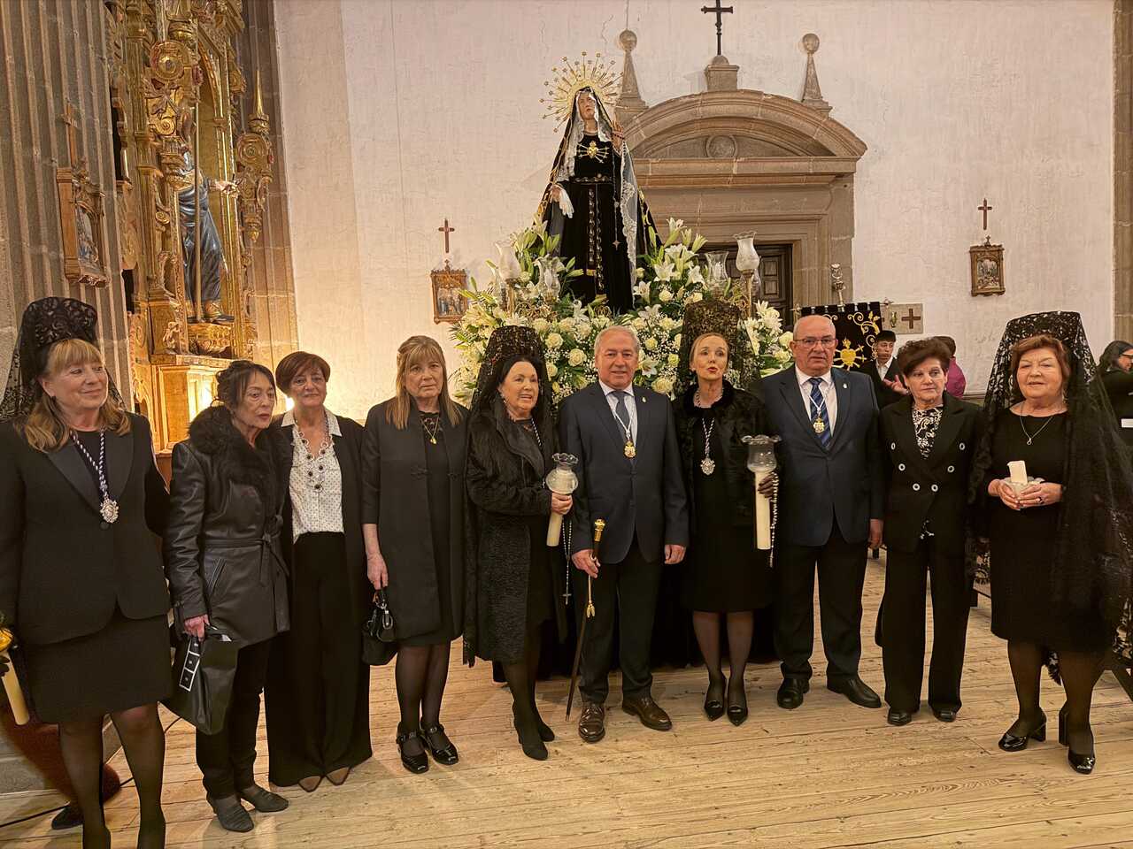El Alcalde, José Tomé Roca, presidió los actos acompañado por la Teniente Alcalde, Gloria Prada; el Concejal de Obras, Medio Rural y Servicios, José Luis Losada; y la Concejal de Mujer, Igualdad y Consumo, Regina López, junto con otros miembros de la Corporación Municipal. La ceremonia contó con la actuación de la Coral Polifónica, que acompañó la eucaristía con un repertorio solemne, y con los adornos florales que engalanaron las imágenes, así como el estreno del nuevo vestido de la Virxe Dolorosa.