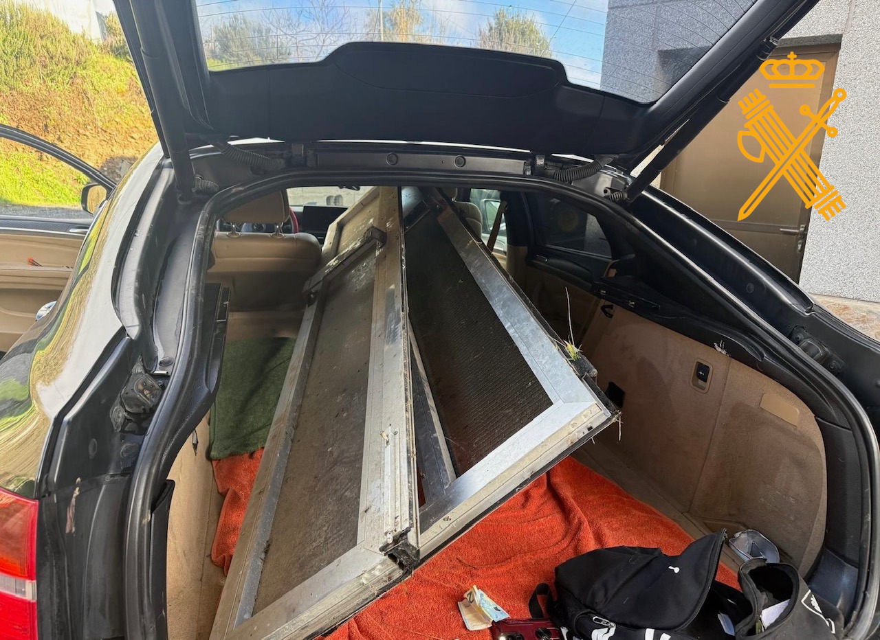 Ante estos indicios, la Guardia Civil estableció un dispositivo en las inmediaciones del casco urbano de Quiroga, donde identificó al conductor de un turismo de características similares. En el interior del vehículo hallaron varias puertas de aluminio, una mochila, dos cuchillos de grandes dimensiones, un hacha y un martillo. También se localizó una bolsa de plástico con 50 gramos de una sustancia, supuestamente marihuana.