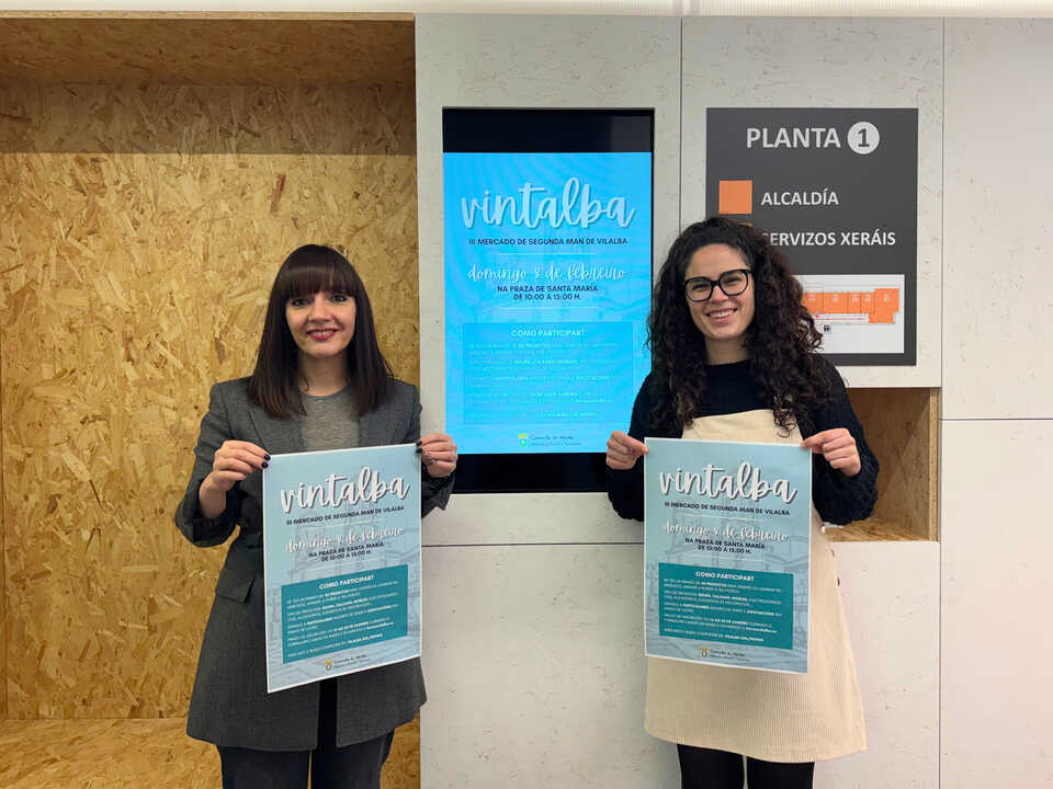Marta Rouco, alcaldesa de Vilalba, y Paula Vigo, concelleira de Feiras e Mercados, presentaron una nueva edición del mercado de segunda mano «Vintalba», que alcanza su tercera convocatoria y se celebrará el domingo 8 de febrero, en coincidencia con la feria mensual de la localidad, en la Praza de Santa María.
