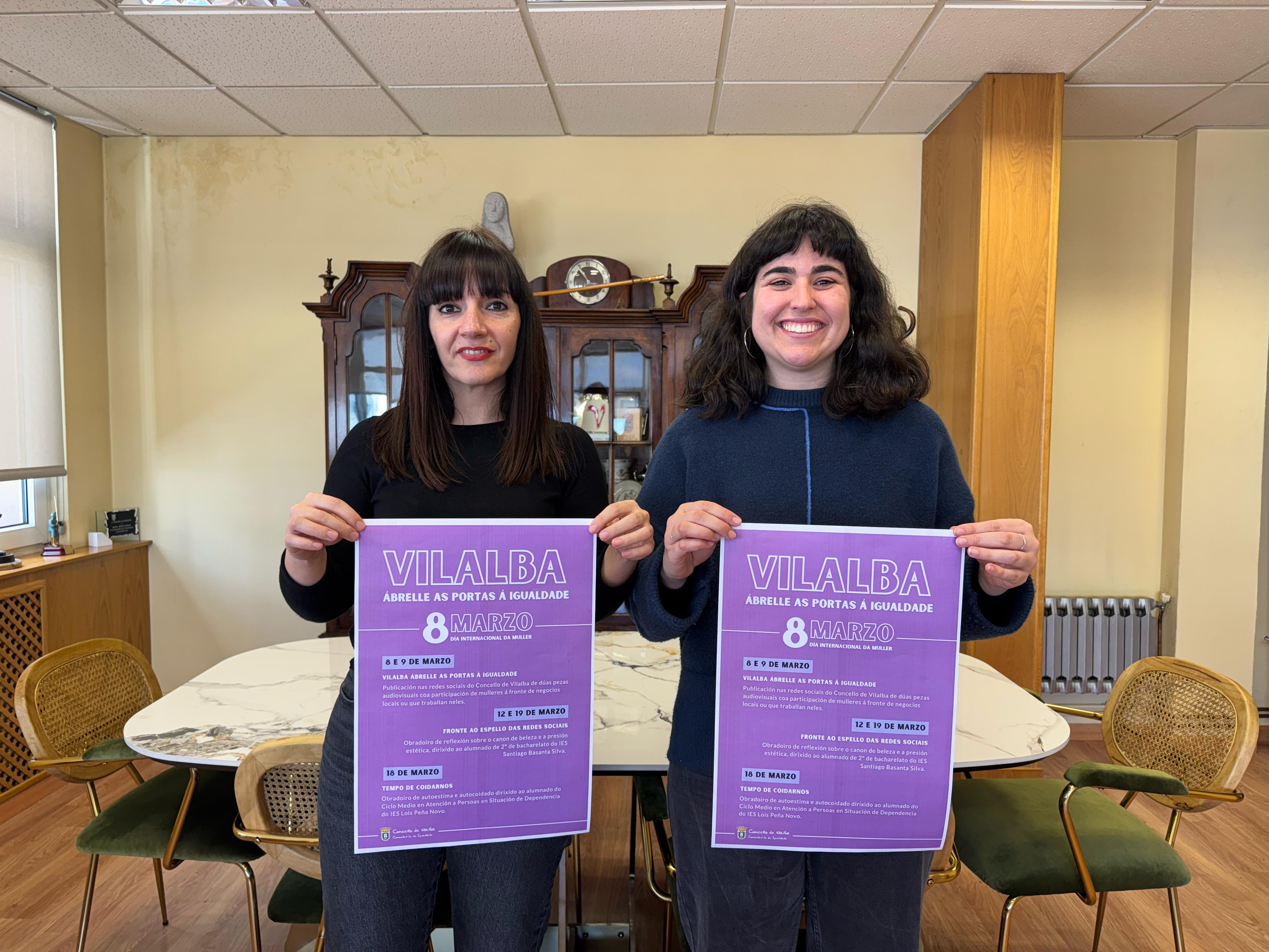 El Concello de Vilalba ha presentado las actividades que organizará por el 8-M. El sábado 8 y domingo 9, se publicarán en las redes sociales dos piezas audiovisuales en las que mujeres que están al frente de negocios locales o trabajan en ellos relatarán su experiencia. La alcaldesa Marta Rouco explica que «o obxectivo é reflexionar e concienciar, xa que aínda queda moito camiño por percorrer para acadar unha igualdade real».